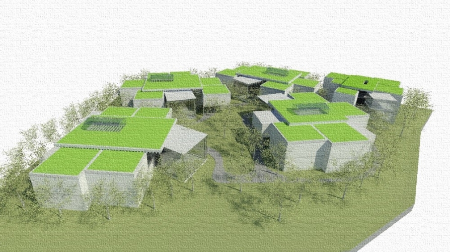 International school based on the Herforder (Lernhaus) model - clusters of classrooms, self-study centre, teachers' team room, toilet facilities around a forum.